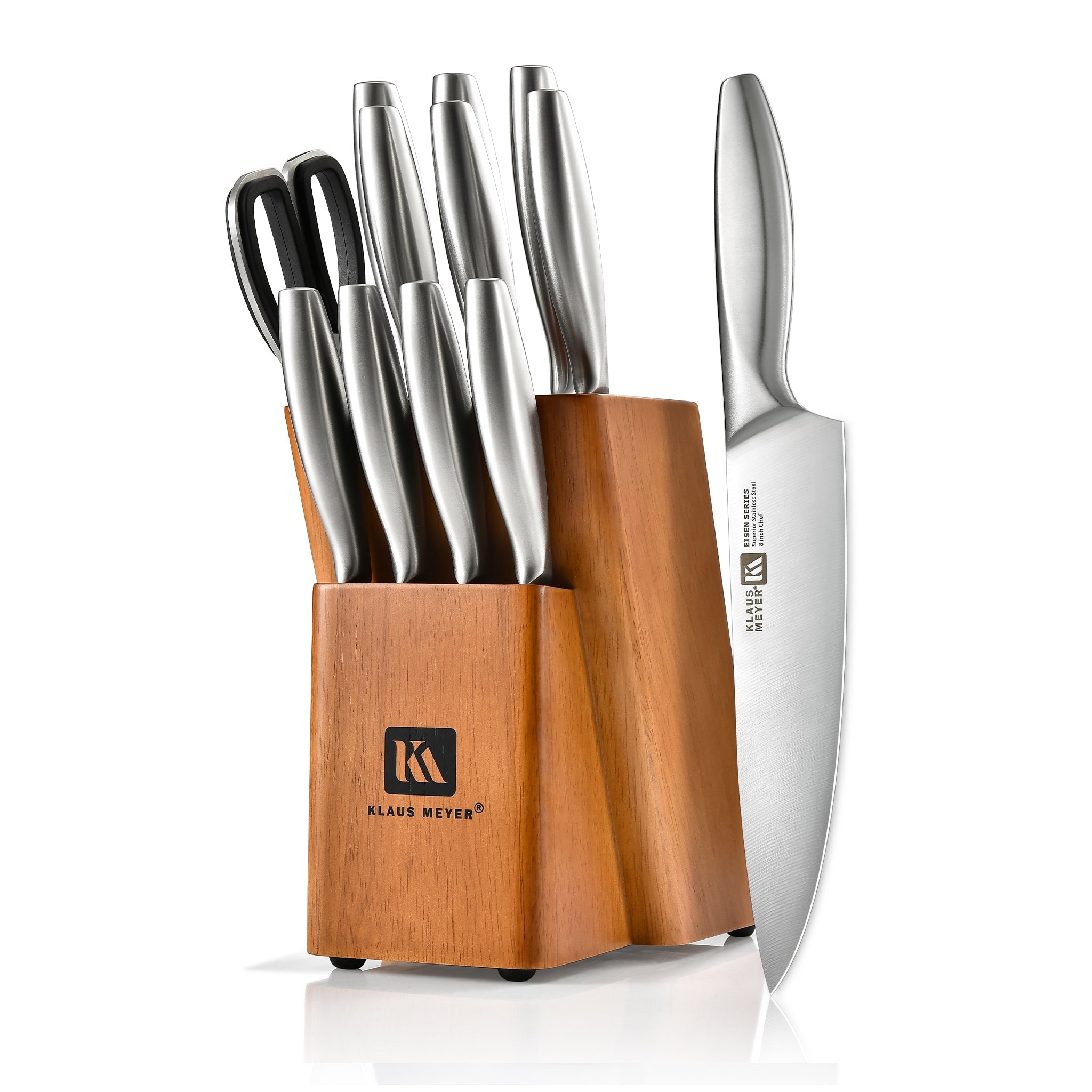 The Set includes an 8'' chef's knife, 8'' bread knife, 8'' carving knife, 6'' boning knife, 5.5'' santoku knife, 5'' serrated utility knife, 3.5'' paring knife, 4 pieces of 5'' steak knives, ktichen scissors and solid wooden block for every needs in your kitchen.